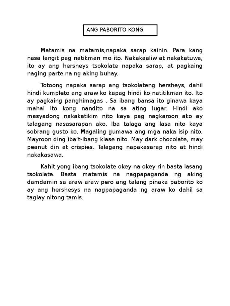 Ang dahilan ng pagsulat ko ng lathala na ito sa wikang filipino at hindi sa wikang ingles ay dahil ang piling mambabasa nito ay ang aking mga kababayan ang mga Filipino. Kahit sinigang na baboy ang kainin ko sa umaga tanghali at gabi ay hindi pa rin ako nagsasawa. Sumunod naman naming teacher sa MAPEH ay si Maam Vargas.