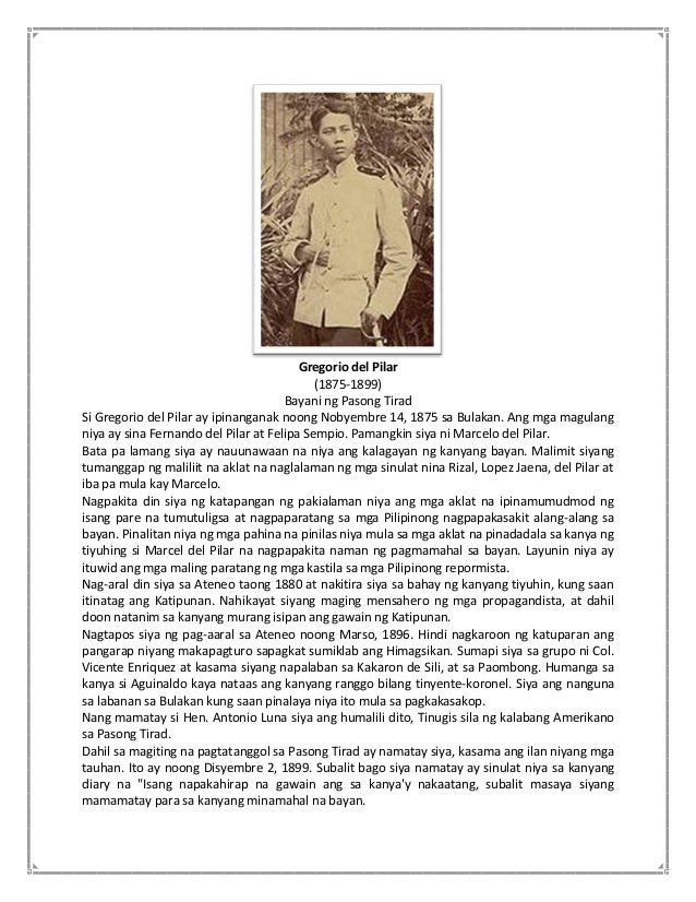 Talambuhay ni gregorio del pilar tagalog buod. Del Pilar National High School ngayon nang siya ang magwagi ng dalawang unang gantimpala sa timpalak-panitik na inilunsad ng paaralan kaugnay ng pagdiriwang sa Araw ni Balagtas Abril 2 1947. Gregorio del Pilar 1875 1899 was one of the youngest generals during the Philippine Revolution and the Philippine-American War earning him the moniker Boy General He died at the Battle of Tirad Pass against the Texas Regiment at the age of 24. Sina Fernando del Pilar at Felipa Sempio ang mga magulang niya.