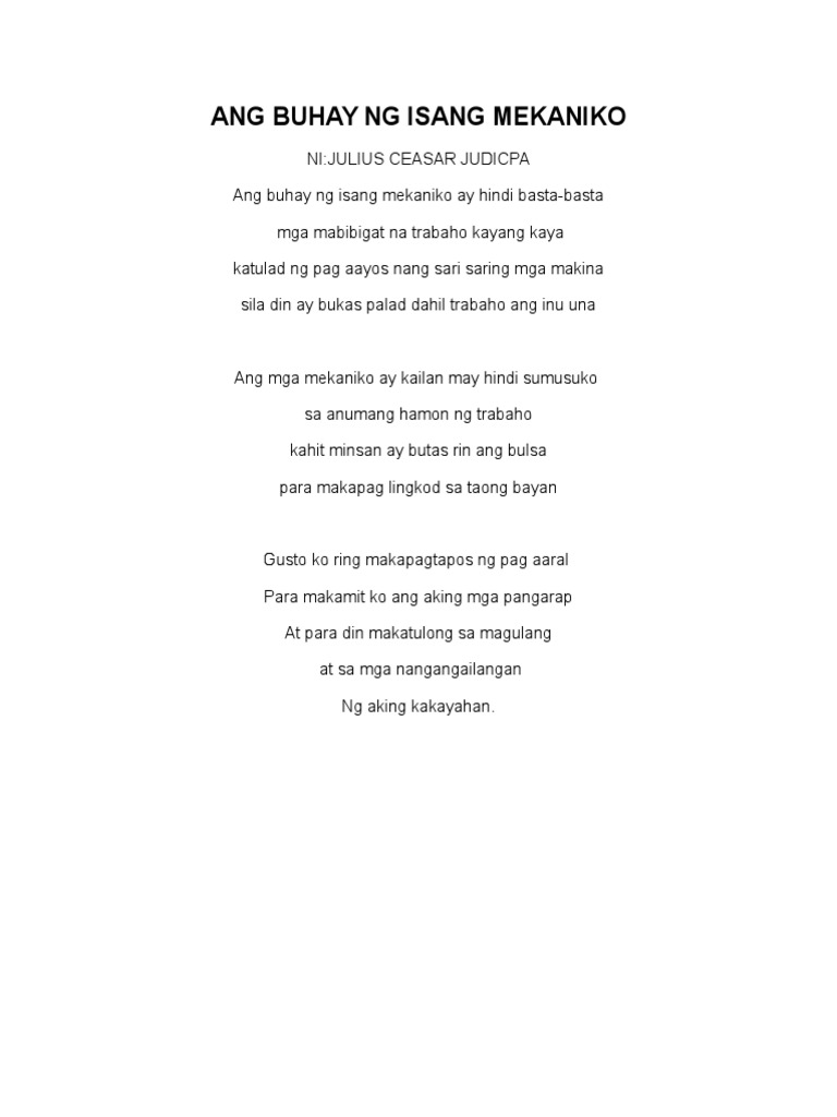 Binabagtas ng iyong dalumat ang bawat bakat bawat lamat at pilat ng tatlong dekadang paghahanap sa balon ng buhay na walanghanggan na nakatato sa iyong noo sa iyong pisngi sa iyong mukhang tinatabingan ng iyong buhok na pinahaba upang matakpan ang iyong mga kasalanan. Ng aking mahal na si nanay at tatay. 10 Na Mga Halimbawa Ng Tula Tulang Pilipino.
