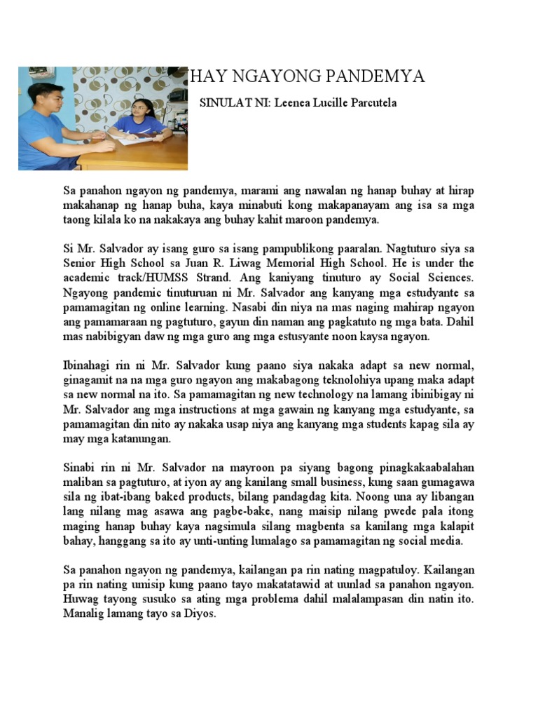 Pero ang pinakamahalaga ay ang pagrespeto sa mga. Ngayon ang buhay pag-ibig sa murang edad ang pinagkaka-abalahan at nagiging hadlang sa matagumpay na pag-aaral. Binago ng pandemya ang buhay natin.