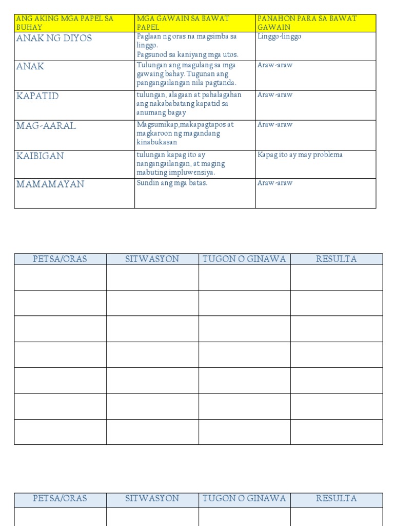 Tungkulin ng nakatatandang anak na babae 1. Plano ng Pagsasabuhay ng Aking Personal na Pahayag ng Misyon sa Buhay PPMB Ang Aking mga Papel sa Buhay Mga Gawain sa Bawat Papel Panahon para sa Bawat Gawain Mabuting anak ng Diyos Pagtatalaga ng regular na prayer time sa isang tahimik na lugar Pagsimba nang regular kasama ang pamilya 20 minuto sa madaling-araw at sa gabi bago. Subukin Basahin at unawaing mabuti ang bawat bilang.