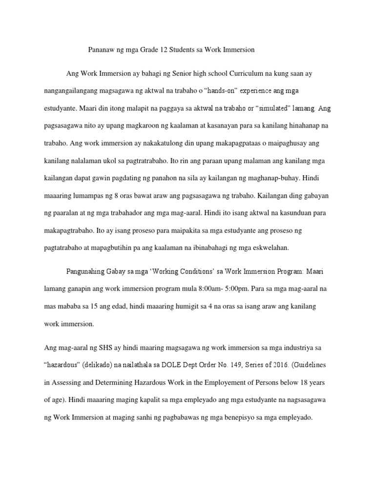 Pananaw Ng Mga Grade 12 Students Sa Work Immersion Pdf