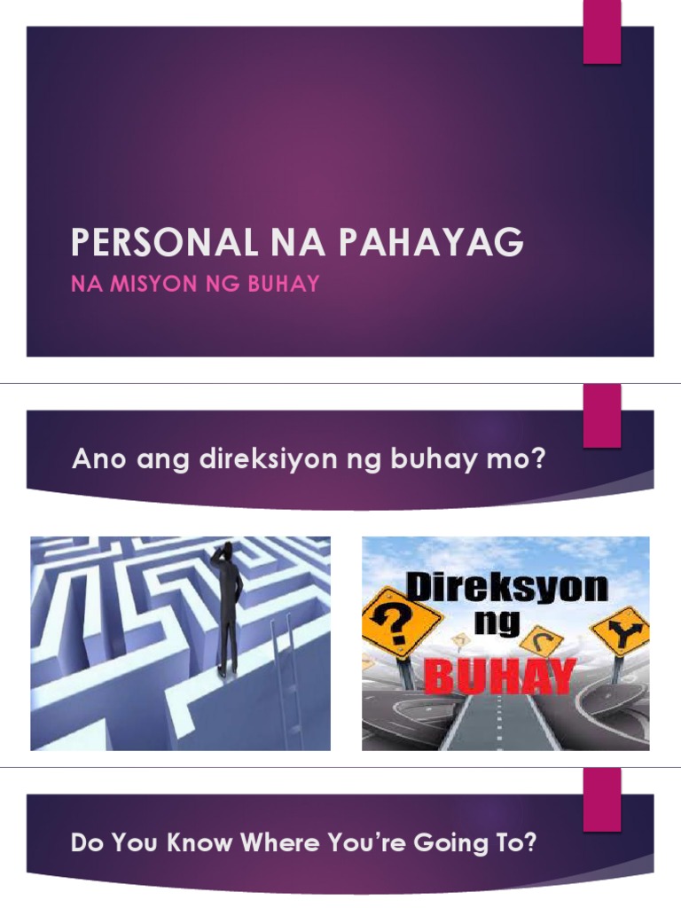 Ano-ano ang kahulugan ng Personal na Pahayag ng Misyon sa Buhay. Kung kayat mahalaga na ngayon pa lamang ay makabuo ka ng iyong personal na misyon sa buhay upang mula dito ay makita mo o masalamin kung saan. Sa ngayon ay.